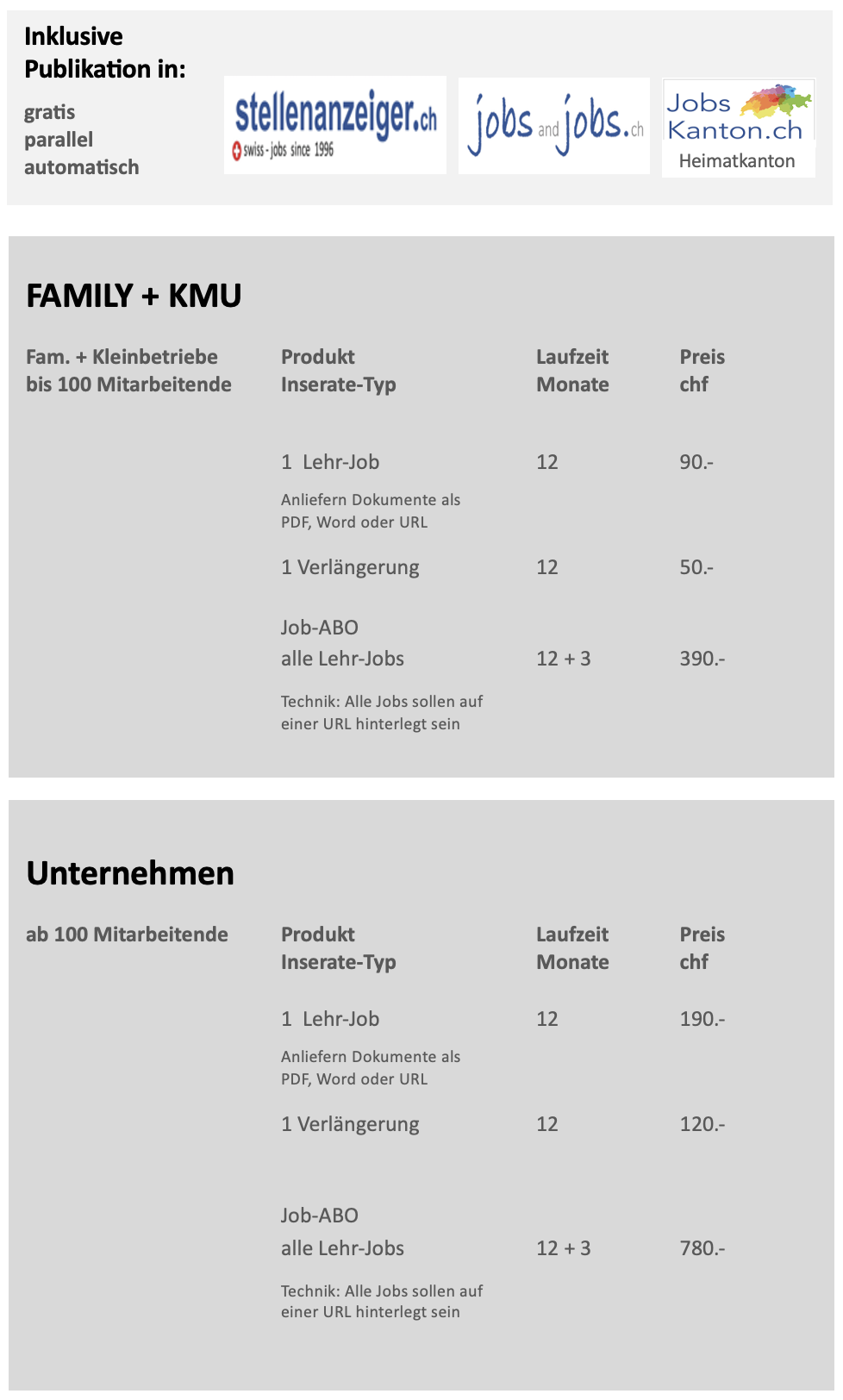 Publikations-Auftrag für Lehrjob, Lehrstelle, Praktika u.ä. in LEHR-JOBS.ch + Stellenanzeiger + JOBSandJOBS.ch + Heimatkanton